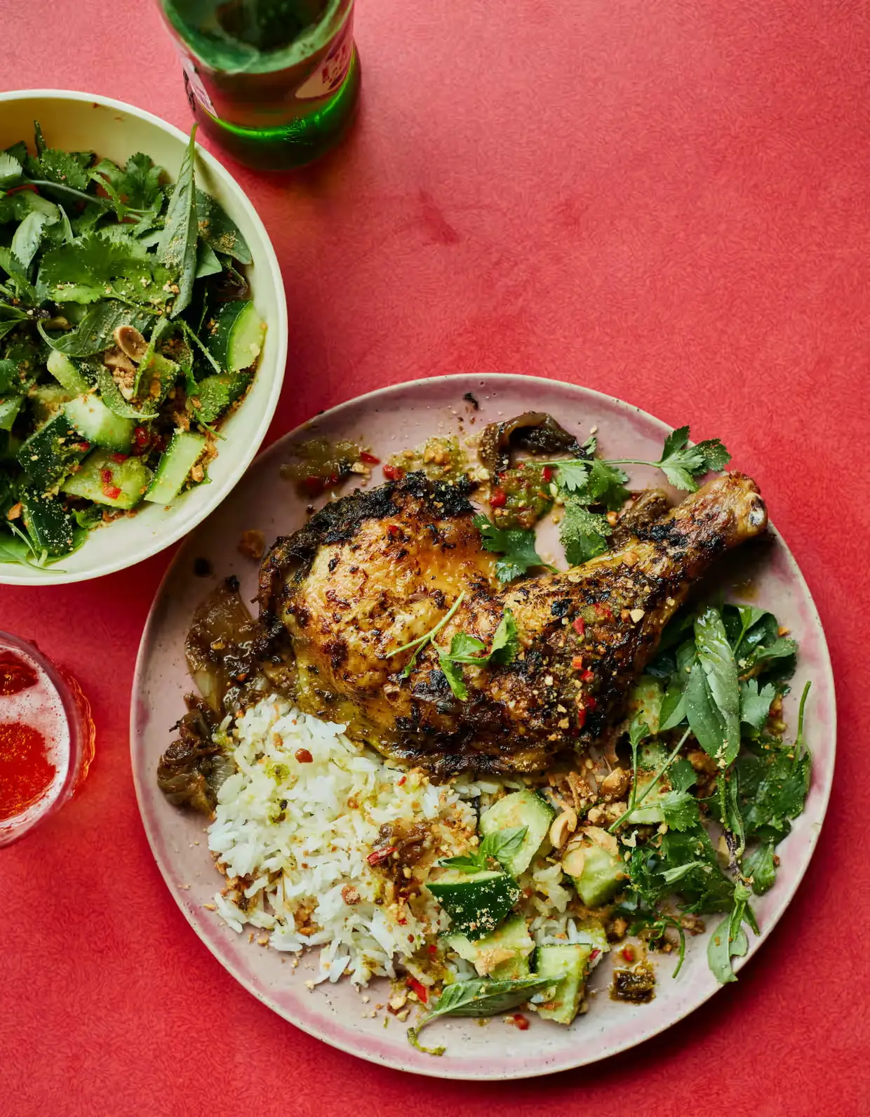 Season the peanuts with a pinch of salt, then toss with the cucumber salad. Serve the chicken with a few roast shallots, a scoop of rice and a mound of salad, and top with an extra sprinkling of peanuts.